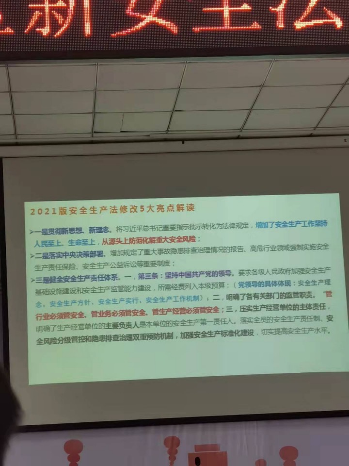 日開(kāi)展新《安全生產(chǎn)法》知識(shí)專題培訓(xùn),進(jìn)一步宣傳貫徹新《安全生產(chǎn)法》的實(shí)施,有效落實(shí)安全生產(chǎn)職責(zé),提升安全生產(chǎn)防范意識(shí),有效防范和遏制安全生產(chǎn)事故發(fā)生。